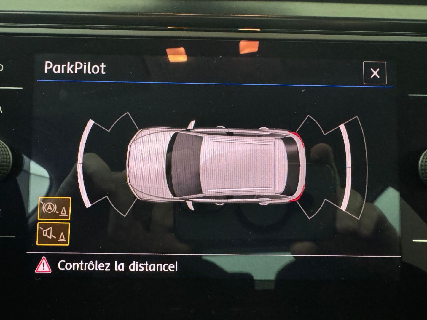 | Aide au stationnement AV/AR avec signaux sonores et visualisation de la distance des obstacles sur l'écran | |