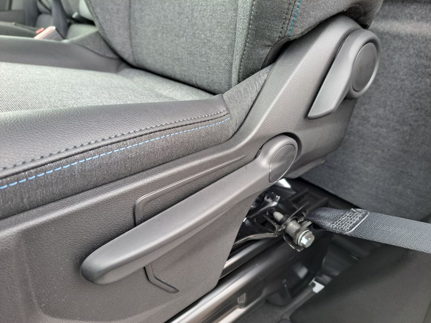 | Sellerie tissu chiné gris avec surpiqûres bleu + côté d'assise conducteur renforcé en textile enduit | |