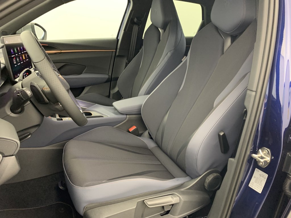 Design interieur deep ocean (sieges baquets TEP + textile bleu acier) - logos cupra estampes sur les appuie-tetes - planche de bord bleu acier texturee avec aerateurs cuivres - contre-portes en TEP noir texture - ciel de pavillon noir - sieges co